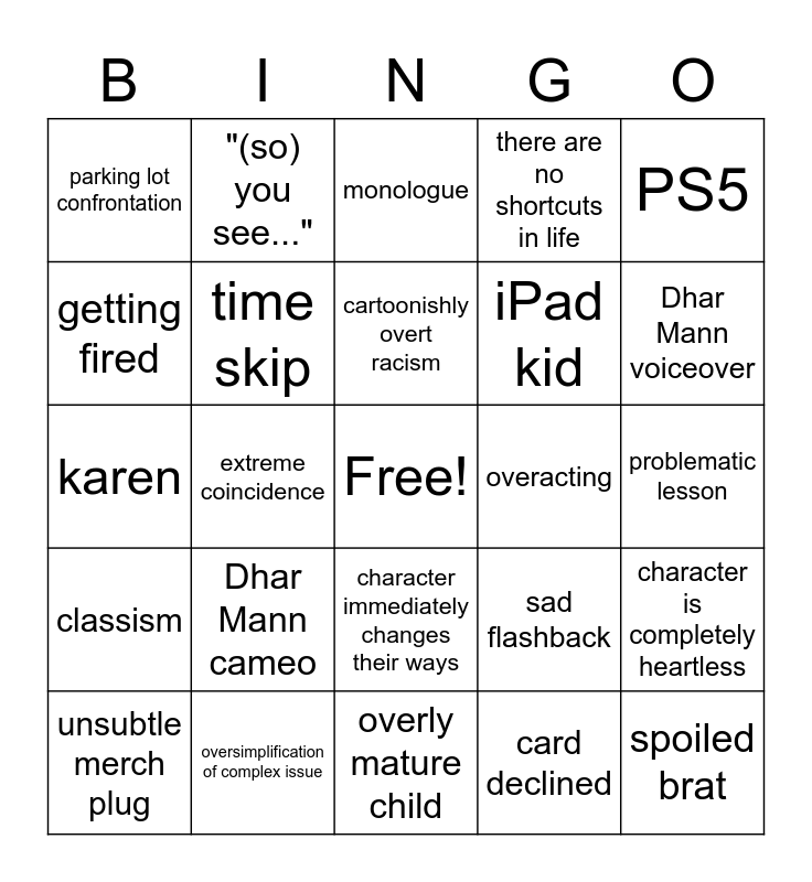 This bingo card has a free space and 34 words: Ableism, card declined, secretly rich, Hollywood stereotype character, classism, time skip, PS5, unsubtle merch plug, "(so) you see...", mean girl, cartoonishly overt racism, monologue, character went through the same thing, unreasonably forgiving, overacting, Dhar Mann voiceover, oversimplification of complex issue, karen, Dhar Mann cameo, sad flashback, character immediately changes their ways, wanting expensive thing, parking lot confrontation, problematic lesson, overly mature child, spoiled brat, there are no shortcuts in life, repetition of core message, iPad kid, getting fired, homeless person, extreme coincidence, character is completely heartless and kid is bullied.