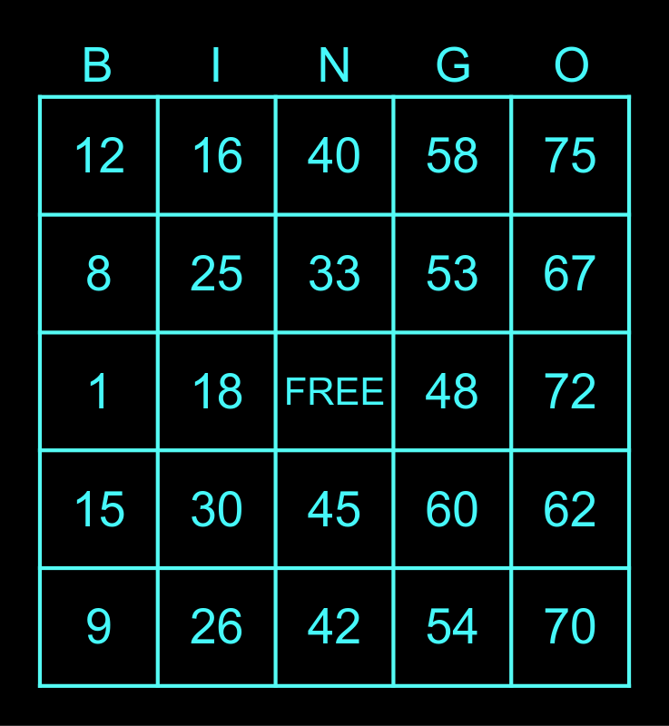 This bingo card has a free space and 24 words: 9, 30, 33, 54, 75, 12, 16, 40, 48, 72, 1, 25, 60, 62, 8, 26, 42, 58, 67, 15, 18, 45, 53 and 70.