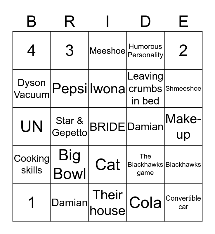 This bingo card has a free space and 24 words: Big Bowl, Damian, Iwona, 1, 2, 4, Dyson Vacuum, 3, Damian, Cat, Leaving crumbs in bed, UN, The Blackhawks game, Blackhawks, Pepsi, Cola, Make-up, Meeshoe, Shmeeshoe, Star & Gepetto, Convertible car, Cooking skills, Humorous Personality and Their house.