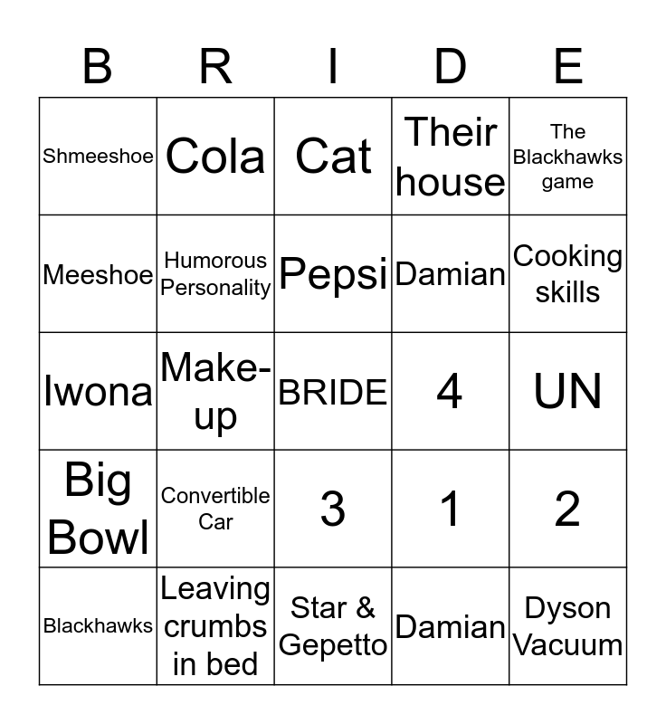 This bingo card has a free space and 24 words: Convertible Car, Leaving crumbs in bed, Pepsi, Blackhawks, The Blackhawks game, Shmeeshoe, Meeshoe, Cola, 4, 3, Damian, Iwona, 1, 2, Humorous Personality, Damian, UN, Cat, Cooking skills, Make-up, Dyson Vacuum, Big Bowl, Their house and Star & Gepetto.