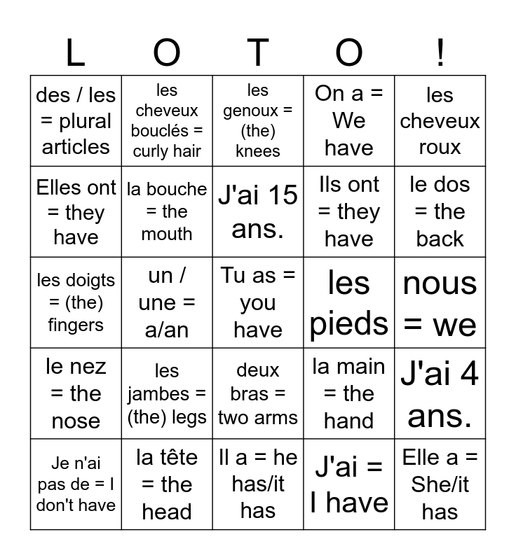 This bingo card has a free space and 34 words: cheveux = hair, J'ai = I have, les yeux = (the) eyes, les oreilles = (the) ears, le nez = the nose, la bouche = the mouth, les cheveux roux, Je n'ai pas de = I don't have, les cheveux bouclés = curly hair, les épaules = (the) shoulders, J'ai 15 ans., les genoux = (the) knees, le / la / le = the, un ventre = a stomach, les pieds, le dos = the back, la tête = the head, les doigts = (the) fingers, les jambes = (the) legs, la main = the hand, deux bras = two arms, avoir = to have, des / les = plural articles, nous = we, Il a = he has/it has, Elle a = She/it has, On a = We have, Nous avons = We have, Ils ont = they have, Elles ont = they have, un corps = a body, un / une = a/an, J'ai 4 ans. and J'ai 40 ans..