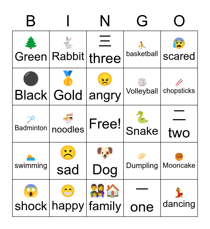 This bingo card has a free space and 24 words: ☹️ sad, 😁 happy, 😠 angry, 😱 shock, 😰 scared, 🌲Green, ⚫️ Black, 🐇 Rabbit, 🐍 Snake, 🐶 Dog, 🏐 Volleyball, 🏸 Badminton, 🥟 Dumpling, 🥮 Mooncake, 🥇 Gold, 一one, 二two, 三three, 🥢chopsticks, 🍜noodles, 💃dancing, 🏊swimming, ⛹️basketball and 👨👩👧👦🏠family.