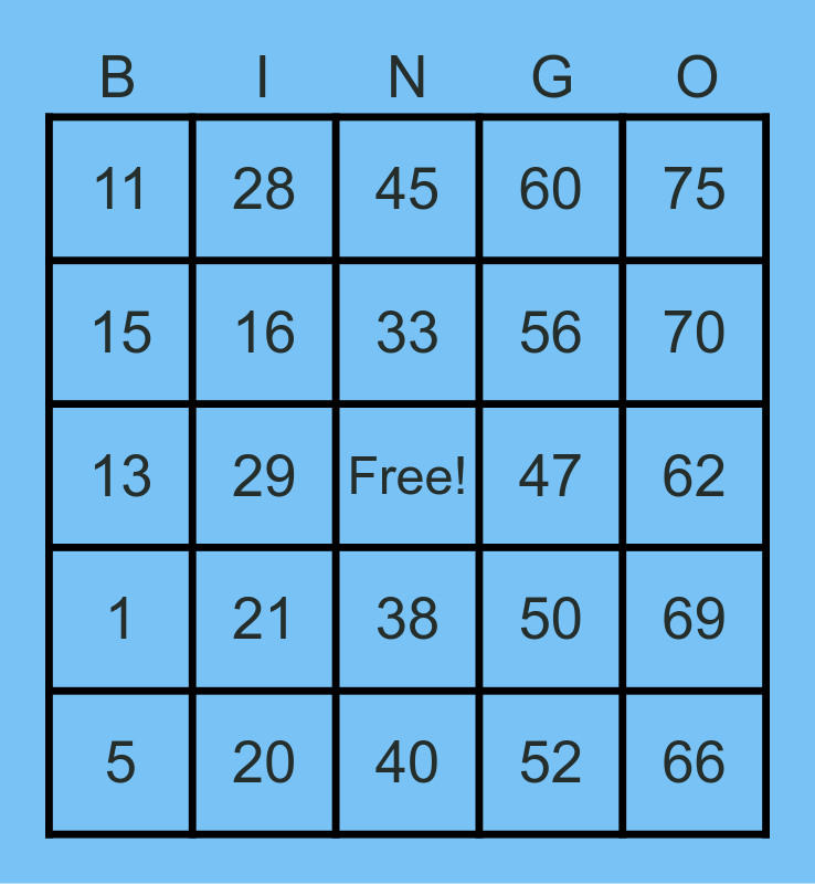 This bingo card has a free space and 24 words: 5, 21, 33, 52, 75, 11, 28, 45, 47, 62, 13, 16, 50, 69, 15, 20, 40, 60, 70, 1, 29, 38, 56 and 66.