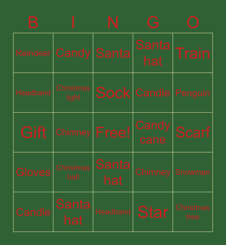 This bingo card has a free space and 24 words: Christmas ball, Santa hat, Sock, Candle, Train, Reindeer, Headband, Candy, Candy cane, Santa hat, Candle, Gift, Chimney, Snowman, Christmas light, Star, Scarf, Santa, Penguin, Chimney, Christmas tree, Gloves, Santa hat and Headband.