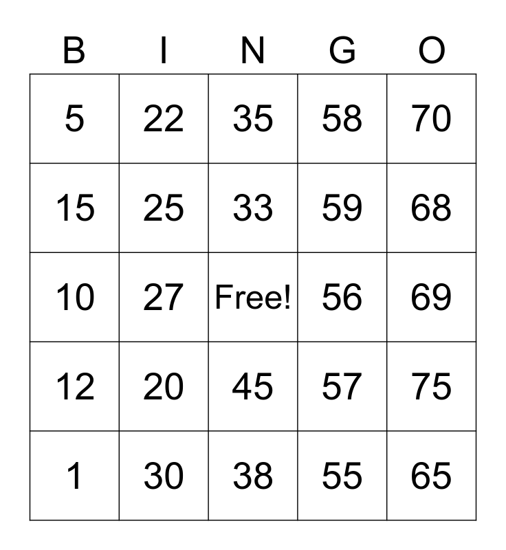 This bingo card has a free space and 24 words: 1, 20, 33, 55, 70, 5, 22, 35, 56, 69, 10, 25, 57, 75, 15, 30, 38, 58, 68, 12, 27, 45, 59 and 65.