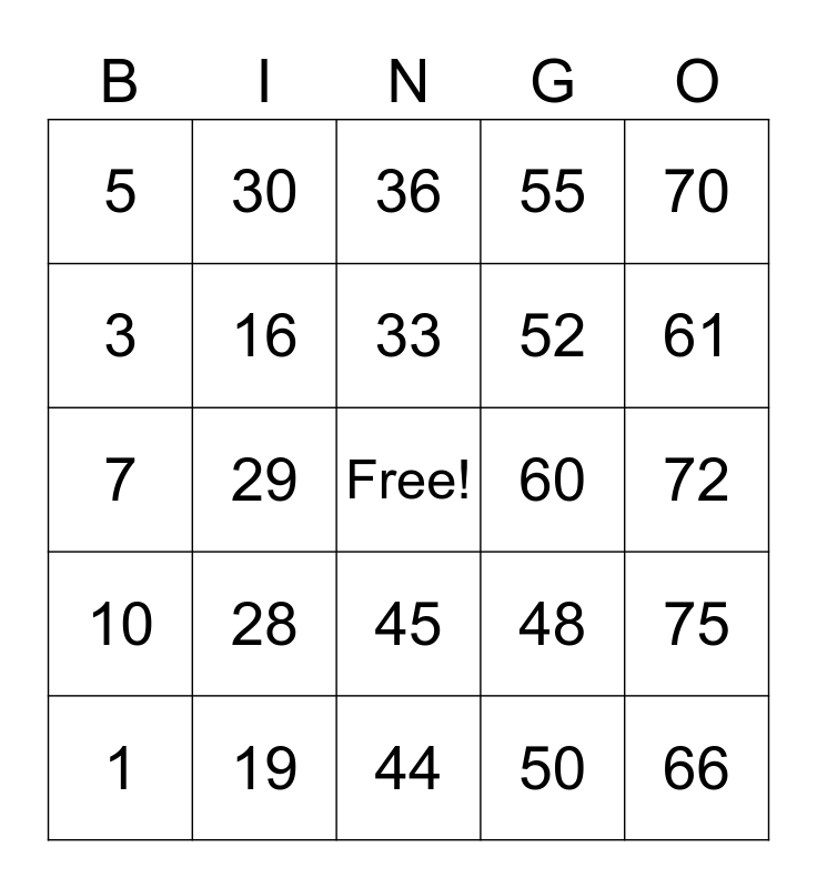 This bingo card has a free space and 24 words: 1, 28, 33, 50, 70, 5, 30, 36, 60, 72, 7, 16, 48, 75, 3, 19, 44, 55, 61, 10, 29, 45, 52 and 66.