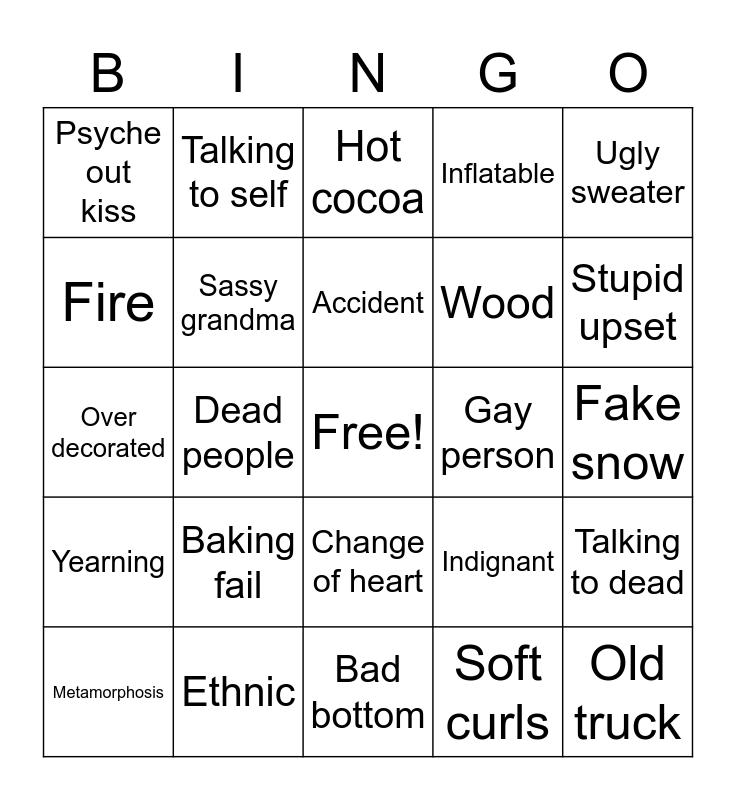 This bingo card has a free space and 29 words: Metamorphosis, Exasperated, Dead people, Tree different, Psyche out kiss, Hot cocoa, Sassy grandma, Baking fail, Gay person, Ethnic, Fake snow, Old truck, Bad bottom, Soft curls, Stupid upset, Snarky assistant, Change of heart, Yearning, Ugly sweater, Over decorated, Indignant, Faux driving, Wood, Fire, Inflatable, Talking to self, Talking to dead, Accident and Mayor.