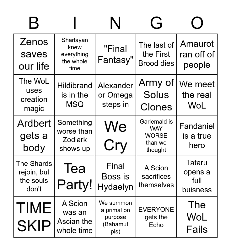 This bingo card has a free space and 24 words: Tea Party!, A Scion was an Ascian the whole time, Alexander or Omega steps in, TIME SKIP, Amaurot ran off of people, Zenos saves our life, The WoL uses creation magic, Sharlayan knew everything the whole time, Garlemald is WAY WORSE than we thought, Final Boss is Hydaelyn, Army of Solus Clones, Ardbert gets a body, A Scion sacrifices themselves, Tataru opens a full buisness, Hildibrand is in the MSQ, EVERYONE gets the Echo, Fandaniel is a true hero, "Final Fantasy", We meet the real WoL, Something worse than Zodiark shows up, The WoL Fails, The Shards rejoin, but the souls don't, The last of the First Brood dies and We summon a primal on purpose (Bahamut pls).