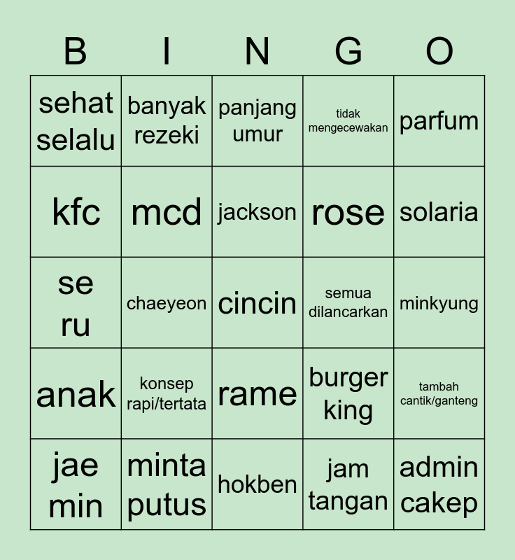 This bingo card has 25 words: anak, minta putus, cincin, jam tangan, parfum, sehat selalu, banyak rezeki, panjang umur, semua dilancarkan, tambah cantik/ganteng, kfc, mcd, hokben, burger king, solaria, jae min, chaeyeon, jackson, rose, minkyung, se ru, konsep rapi/tertata, rame, tidak mengecewakan and admin cakep.