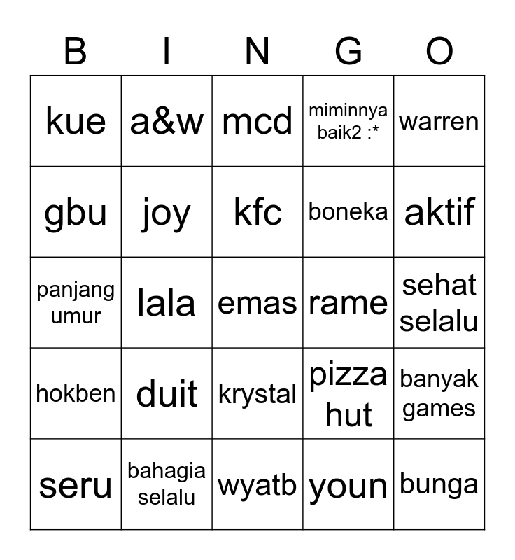 This bingo card has 25 words: duit, wyatb, kfc, seru, warren, kue, gbu, a&w, rame, krystal, boneka, panjang umur, pizza hut, banyak games, joy, bunga, sehat selalu, mcd, aktif, lala, emas, bahagia selalu, hokben, miminnya baik2 :* and youn.