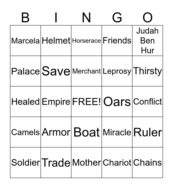 This bingo card has a free space and 24 words: Armor, Trade, Merchant, Soldier, Judah Ben Hur, Marcela, Palace, Helmet, Oars, Boat, Leprosy, Healed, Miracle, Ruler, Save, Chariot, Conflict, Horserace, Thirsty, Empire, Chains, Camels, Friends and Mother.