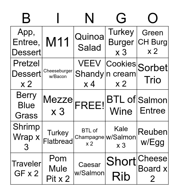 This bingo card has a free space and 24 words: Turkey Flatbread, Pom Mule Pit x 2, VEEV Shandy x 4, Traveler GF x 2, Green CH Burg x 2, App, Entree, Dessert, Pretzel Dessert x 2, M11, BTL of Wine, BTL of Champagne x 2, Cookies n cream x 2, Berry Blue Grass, Kale w/Salmon x 3, Reuben w/Egg, Cheeseburger w/Bacon, Short Rib, Salmon Entree, Quinoa Salad, Sorbet Trio, Mezze x 3, Cheese Board x 2, Shrimp Wrap x 3, Turkey Burger x 3 and Caesar w/Salmon.
