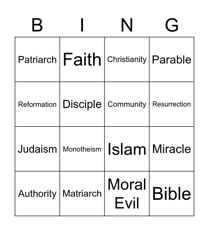 This bingo card has 20 words: Miracle, Pilgrimage, Christianity, Prophet, Authority, Reformation, Matriarch, Patriarch, Judaism, Faith, Monotheism, Islam, Disciple, Bible, Community, Vocation, Resurrection, Parable, Moral Evil and Natural Evil.