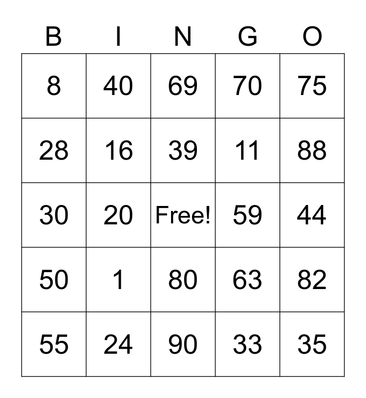 This bingo card has a free space and 24 words: 1, 24, 39, 55, 75, 8, 28, 40, 59, 80, 11, 30, 63, 82, 16, 33, 44, 69, 88, 20, 35, 50, 70 and 90.