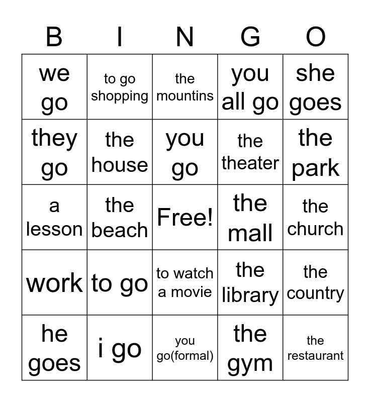 This bingo card has a free space and 24 words: to go, i go, you go, he goes, she goes, we go, they go, to go shopping, the mall, to watch a movie, the theater, a lesson, the library, the country, the house, the gym, the church, the mountins, the park, the beach, the restaurant, work, you all go and you go(formal).