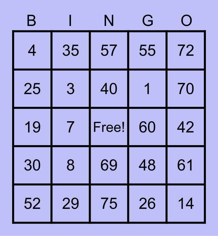 This bingo card has a free space and 24 words: 8, 29, 40, 52, 72, 4, 25, 35, 60, 69, 1, 19, 48, 61, 3, 26, 42, 57, 70, 7, 14, 30, 55 and 75.