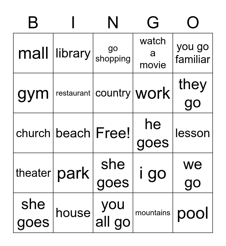 This bingo card has a free space and 24 words: park, house, country, she goes, you go familiar, mall, gym, library, he goes, she goes, work, church, i go, we go, restaurant, mountains, lesson, go shopping, they go, beach, pool, theater, watch a movie and you all go.