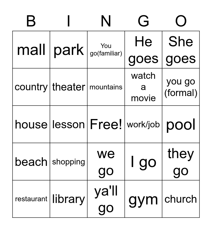 This bingo card has a free space and 24 words: shopping, library, mountains, restaurant, She goes, mall, country, park, work/job, we go, watch a movie, house, I go, they go, theater, gym, pool, You go(familiar), you go (formal), lesson, church, beach, He goes and ya'll go.