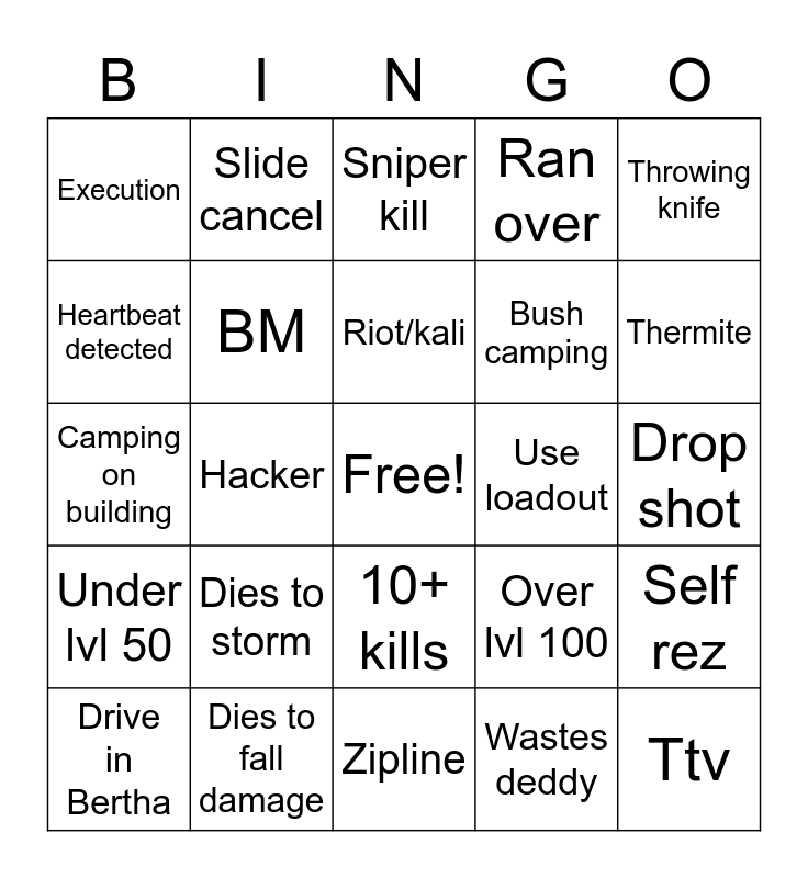 This bingo card has a free space and 24 words: Dies to storm, Dies to fall damage, Riot/kali, Drive in Bertha, Throwing knife, Execution, Heartbeat detected, Slide cancel, Use loadout, 10+ kills, Bush camping, Camping on building, Over lvl 100, Self rez, BM, Wastes deddy, Drop shot, Sniper kill, Thermite, Hacker, Ttv, Under lvl 50, Ran over and Zipline.