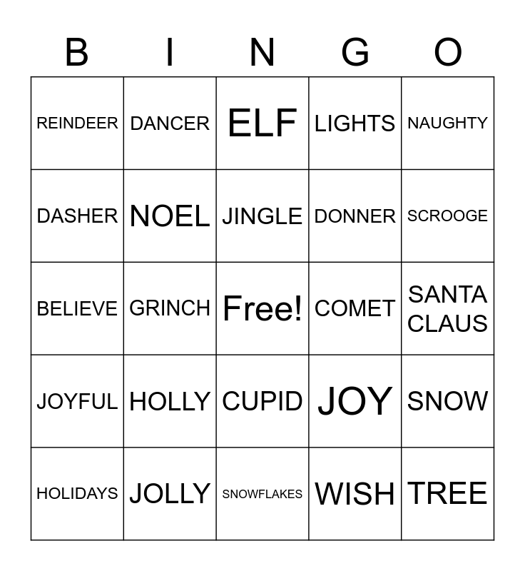 This bingo card has a free space and 24 words: HOLLY, JOLLY, JINGLE, HOLIDAYS, NAUGHTY, REINDEER, DASHER, DANCER, COMET, CUPID, DONNER, BELIEVE, JOY, SNOW, NOEL, WISH, SANTA CLAUS, ELF, SCROOGE, GRINCH, TREE, JOYFUL, LIGHTS and SNOWFLAKES.