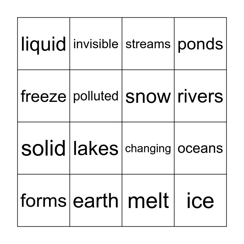 This bingo card has 16 words: earth, oceans, streams, liquid, solid, invisible, changing, melt, freeze, polluted, forms, ponds, lakes, rivers, snow and ice.
