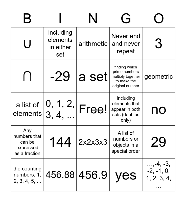 This bingo card has a free space and 24 words: 144, 456.88, a set, the counting numbers; 1, 2, 3, 4, 5, ..., 3, ∪, ∩, including elements in either set, Including elements that appear in both sets (doubles only), 2x2x3x3, finding which prime numbers multiply together to make the original number, a list of elements, A list of numbers or objects in a special order, 29, -29, yes, no, arithmetic, geometric, 0, 1, 2, 3, 4, ..., …,-4, -3, -2, -1, 0, 1, 2, 3, 4, ..., Any numbers that can be expressed as a fraction, Never end and never repeat and 456.9.