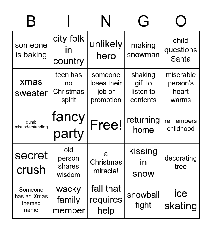 This bingo card has a free space and 34 words: Someone has a secret, snowball fight, someone hates Christmas, some kind of contest, secret crush, teen has no Christmas spirit, child questions Santa, Someone has an Xmas themed name, city folk in country, holiday party, someone loses their job or promotion, unlikely hero, deadline looming, mean old man, returning home, miserable person's heart warms, wacky family member, dumb misunderstanding, old person shares wisdom, kissing in snow, a Christmas miracle!, someone picks up a child, someone is baking, remembers childhood, fall that requires help, ice skating, making snowman, woman gives up on love, shaking gift to listen to contents, xmas sweater, drinking eggnog, fancy party, decorating tree and someone wears a santa hat.