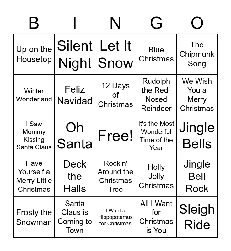 This bingo card has a free space and 24 words: Deck the Halls, Santa Claus is Coming to Town, 12 Days of Christmas, Frosty the Snowman, The Chipmunk Song, Up on the Housetop, Winter Wonderland, Silent Night, It's the Most Wonderful Time of the Year, Rockin' Around the Christmas Tree, Rudolph the Red-Nosed Reindeer, I Saw Mommy Kissing Santa Claus, Holly Jolly Christmas, Jingle Bell Rock, Feliz Navidad, All I Want for Christmas is You, Jingle Bells, Let It Snow, We Wish You a Merry Christmas, Oh Santa, Sleigh Ride, Have Yourself a Merry Little Christmas, Blue Christmas and I Want a Hippopotamus for Christmas.