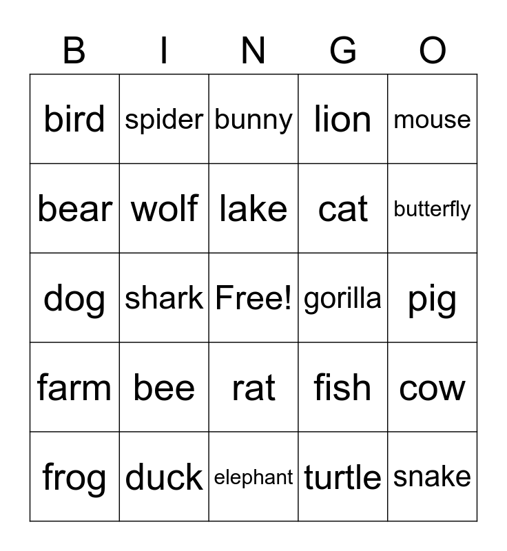 This bingo card has a free space and 24 words: bee, duck, lake, frog, mouse, bird, bear, spider, gorilla, rat, cat, dog, fish, cow, wolf, turtle, pig, bunny, butterfly, shark, snake, farm, lion and elephant.