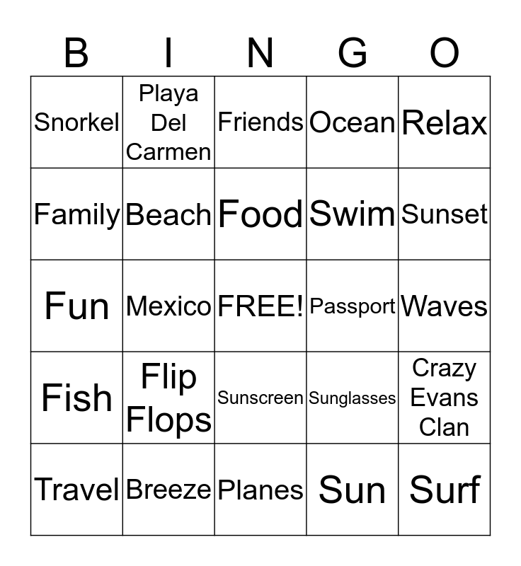 This bingo card has a free space and 24 words: Flip Flops, Breeze, Food, Travel, Relax, Snorkel, Family, Playa Del Carmen, Passport, Sunscreen, Swim, Fun, Sunglasses, Crazy Evans Clan, Beach, Sun, Waves, Friends, Sunset, Mexico, Surf, Fish, Ocean and Planes.