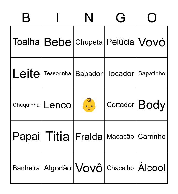 This bingo card has a free space and 24 words: Banheira, Titia, Babador, Chacalho, Vovó, Toalha, Bebe, Chupeta, Cortador, Body, Chuquinha, Tessorinha, Macacão, Carrinho, Leite, Algodão, Vovô, Pelúcia, Sapatinho, Papai, Lenco, Fralda, Tocador and Álcool.