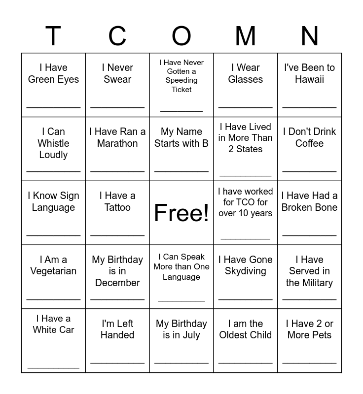 This bingo card has a free space and 24 words: My Birthday is in December __________, I'm Left Handed __________, My Name Starts with B __________, I Have a White Car __________, I've Been to Hawaii __________, I Have Green Eyes __________, I Can Whistle Loudly __________, I Never Swear __________, I have worked for TCO for over 10 years __________, I Can Speak More than One Language __________, I Have Lived in More Than 2 States __________, I Know Sign Language __________, I Have Gone Skydiving __________, I Have Served in the Military __________, I Have Ran a Marathon __________, I am the Oldest Child __________, I Have Had a Broken Bone __________, I Have Never Gotten a Speeding Ticket __________, I Don't Drink Coffee __________, I Have a Tattoo __________, I Have 2 or More Pets __________, I Am a Vegetarian __________, I Wear Glasses __________ and My Birthday is in July __________.