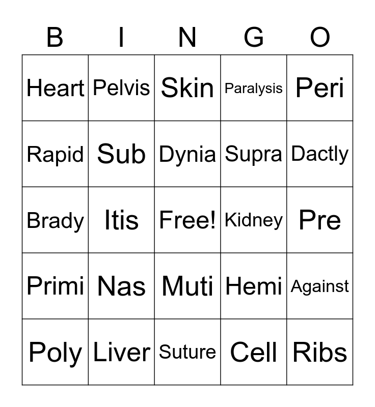 This bingo card has a free space and 24 words: Poly, Nas, Dynia, Cell, Peri, Heart, Pelvis, Skin, Kidney, Pre, Brady, Sub, Hemi, Against, Rapid, Liver, Suture, Paralysis, Dactly, Primi, Itis, Muti, Supra and Ribs.