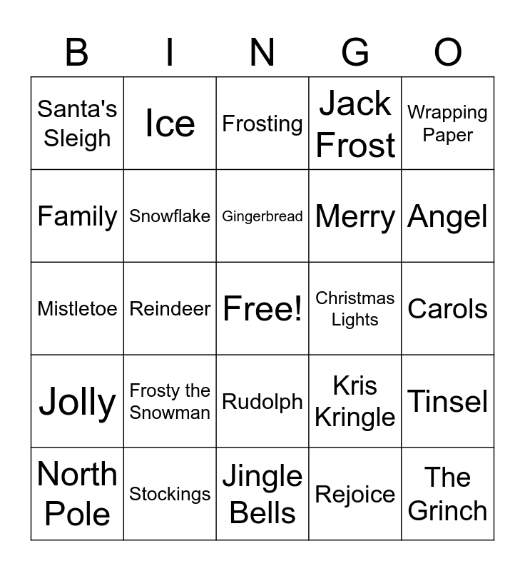 This bingo card has a free space and 33 words: Santa, Elf, Reindeer, Present, Jolly, Snowflake, Wrapping Paper, North Pole, Ice, Cookie, Gingerbread, Frosting, Tree, Wreath, Christmas Lights, Angel, Stockings, Mistletoe, Frosty the Snowman, Kris Kringle, Rudolph, Spirit, Santa's Sleigh, Carols, Jingle Bells, The Grinch, Jack Frost, Merry, Family, Tinsel, Snowball, Rejoice and December 25.