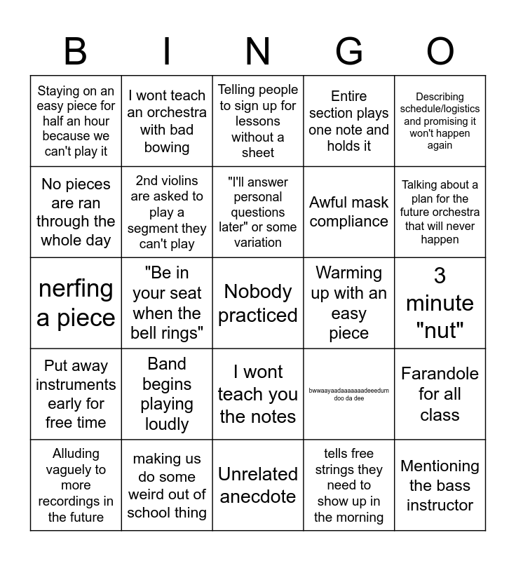 This bingo card has a free space and 37 words: "We teach people to play this way, but in the music industry you have to...", Clapping along with a rhythm/playing it on an open string, Talking about the 2/4 measure in wtk even though nobody cares, 2nd violins are asked to play a segment they can't play, Farandole for all class, Band begins playing loudly, "I'll answer personal questions later" or some variation, Starting a runthrough of a piece, Describing schedule/logistics and promising it won't happen again, bustma phil, "Be in your seat when the bell rings", Entire section plays one note and holds it, Mentioning the bass instructor, 3 minute "nut", No pieces are ran through the whole day, Put away instruments early for free time, Reminder of when the concert is, Telling people to sign up for lessons without a sheet, I wont teach you the notes, Warming up with an easy piece, Staying on an easy piece for half an hour because we can't play it, Talking about a plan for the future orchestra that will never happen, Alluding vaguely to more recordings in the future, Unrelated anecdote, yells about phone, tells free strings they need to show up in the morning, I wont teach an orchestra with bad bowing, essential tech, posture, Talking about percussion, talking about how diverse orchestra is, making us do some weird out of school thing, nerfing a piece, compares us to band and choir/talks about exposure, bwwaayaadaaaaaaadeeedum doo da dee, Awful mask compliance and Write that in!.