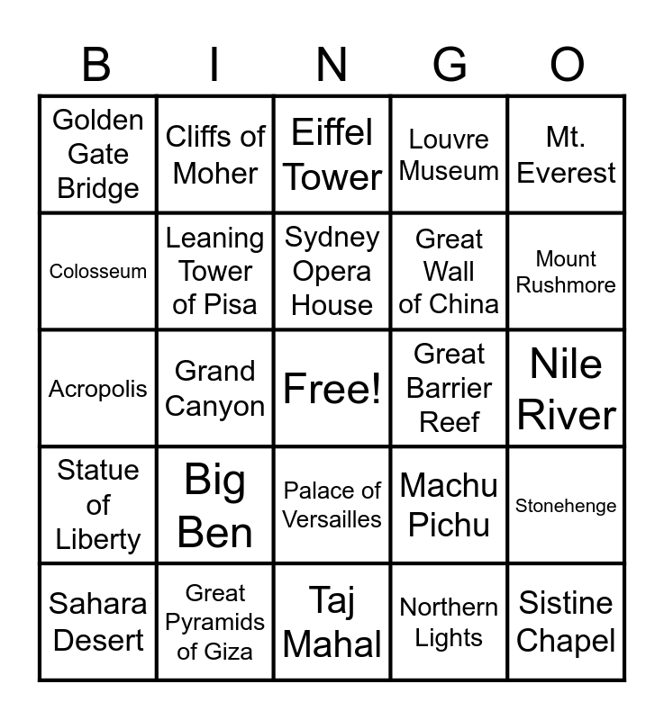 This bingo card has a free space and 24 words: Big Ben, Great Pyramids of Giza, Sydney Opera House, Sahara Desert, Mt. Everest, Golden Gate Bridge, Colosseum, Cliffs of Moher, Great Barrier Reef, Palace of Versailles, Great Wall of China, Acropolis, Machu Pichu, Stonehenge, Leaning Tower of Pisa, Northern Lights, Nile River, Eiffel Tower, Mount Rushmore, Grand Canyon, Sistine Chapel, Statue of Liberty, Louvre Museum and Taj Mahal.