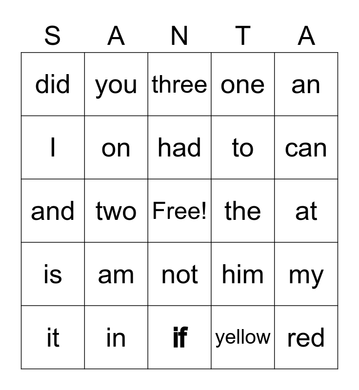 This bingo card has a free space and 24 words: am, in, had, it, an, did, I, you, the, not, to, and, him, my, on, yellow, at, three, can, two, red, is, one and if.