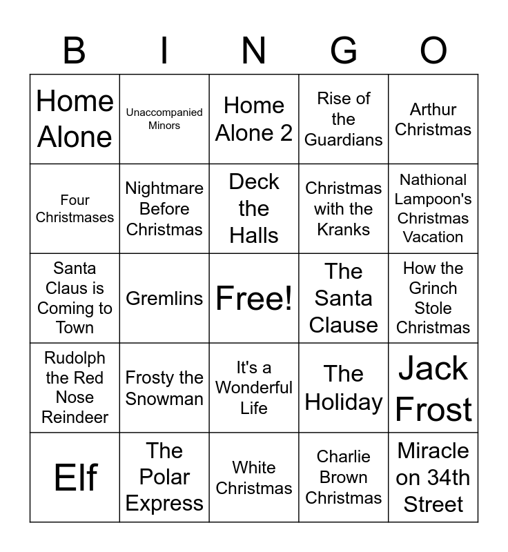 This bingo card has a free space and 29 words: Elf, A Christmas Carol, Gremlins, Jingle all the Way, Home Alone, Home Alone 2, Nightmare Before Christmas, Frosty the Snowman, The Santa Clause, The Polar Express, How the Grinch Stole Christmas, Miracle on 34th Street, White Christmas, Charlie Brown Christmas, Nathional Lampoon's Christmas Vacation, A Christmas Story, It's a Wonderful Life, Rudolph the Red Nose Reindeer, Arthur Christmas, Santa Claus is Coming to Town, The Holiday, Scrooged, Christmas with the Kranks, Four Christmases, Rise of the Guardians, Unaccompanied Minors, Jack Frost, Deck the Halls and The Star.