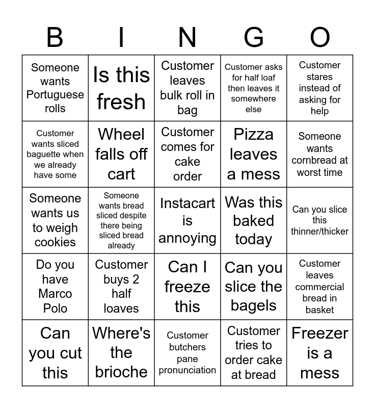 This bingo card has a free space and 24 words: Customer buys 2 half loaves, Where's the brioche, Customer comes for cake order, Can you cut this, Customer stares instead of asking for help, Someone wants Portuguese rolls, Customer wants sliced baguette when we already have some, Is this fresh, Was this baked today, Can I freeze this, Pizza leaves a mess, Someone wants us to weigh cookies, Can you slice the bagels, Customer leaves commercial bread in basket, Wheel falls off cart, Customer tries to order cake at bread, Can you slice this thinner/thicker, Customer leaves bulk roll in bag, Someone wants cornbread at worst time, Someone wants bread sliced despite there being sliced bread already, Freezer is a mess, Do you have Marco Polo, Customer asks for half loaf then leaves it somewhere else and Customer butchers pane pronunciation.