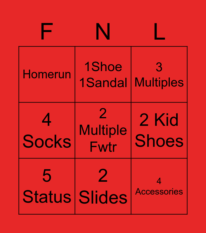 This bingo card has 9 words: 5 Status, 3 Multiples, 1Shoe 1Sandal, 4 Socks, Homerun, 2 Kid Shoes, 2 Multiple Fwtr, 4 Accessories and 2 Slides.