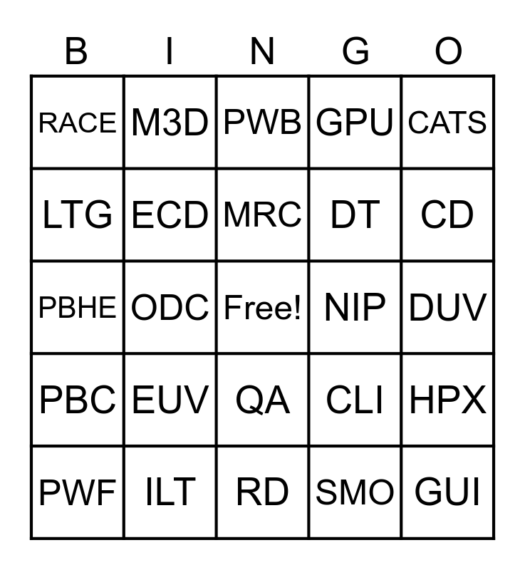 This bingo card has a free space and 59 words: EBO, ILT, OPC, PBC, SMO, Ml, ECD, OSIR, DT, MLO, GPU, NPTD, LTG, SEG, CDMG, RACE, GUI, CATS, DRS, MRC, NIP, PWB, PWF, HPX, T1ZD, SNPS, EPE, NILS, CD, MEEF, PRD, FS, DNT, PDA, M3D, R3D, M13, ODC, MTO, PBHE, GAD, EUV, DUV, PCA, V6, RBAF, MBAF, PE, QA, RD, TAM, TRM, EOU, PV, RPM, CLI, BKM, GDS and PMB.