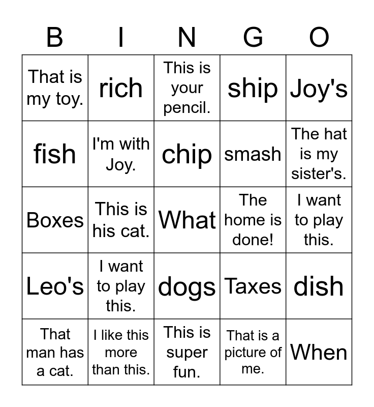 This bingo card has a free space and 29 words: That man has a cat., The cat is a big cat., This is his cat., Where, That is my toy., This is your pencil., I'm with Joy., I want to play this., The home is done!, I like this more than this., I want to play this., When, This is super fun., That is a picture of me., The hat is my sister's., cats, dogs, Leo's, Joy's, Boxes, Taxes, foxes, smash, fish, ship, rich, dish, chip and wish.