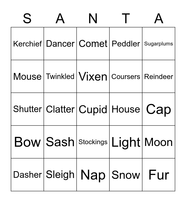 This bingo card has a free space and 34 words: Christmas, Snow, St. Nick, Wreath, Bow, Twinkled, Sugarplums, Dasher, Dancer, Prancer, Vixen, Comet, Donner, Blitzen, House, Reindeer, Sleigh, Shutter, Sash, Light, Stockings, Chimney, Kerchief, Cap, Nap, Fur, Peddler, Soot, Coursers, Mouse, Creature, Clatter, Moon and Beard.