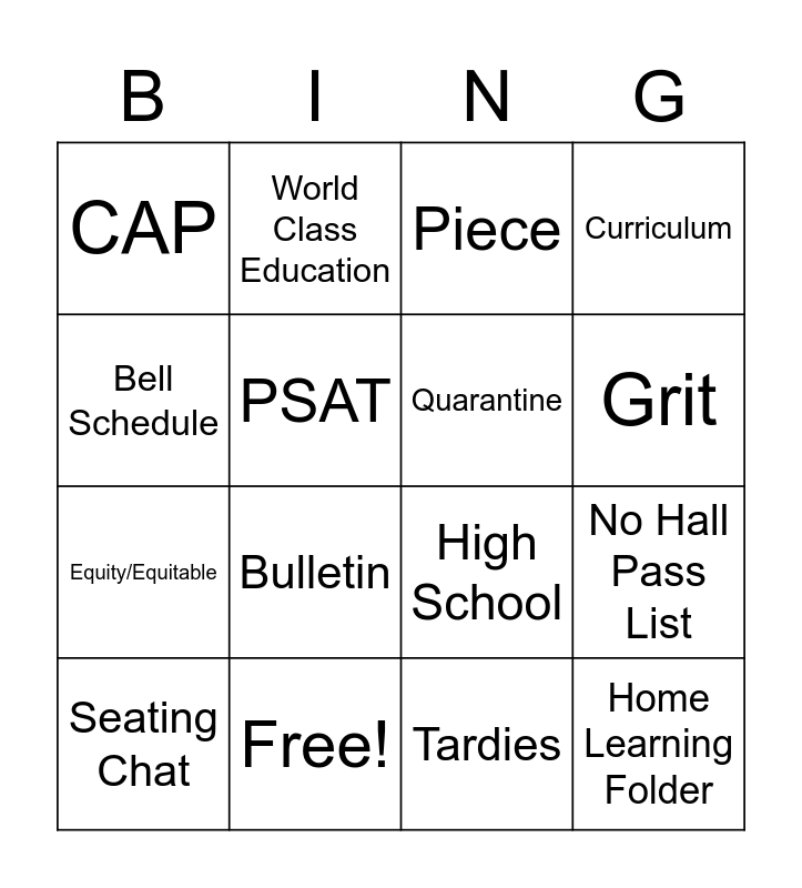 This bingo card has 16 words: Free!, No Hall Pass List, Piece, CAP, Equity/Equitable, World Class Education, High School, Tardies, Bell Schedule, PSAT, Seating Chat, Curriculum, Bulletin, Grit, Quarantine and Home Learning Folder.