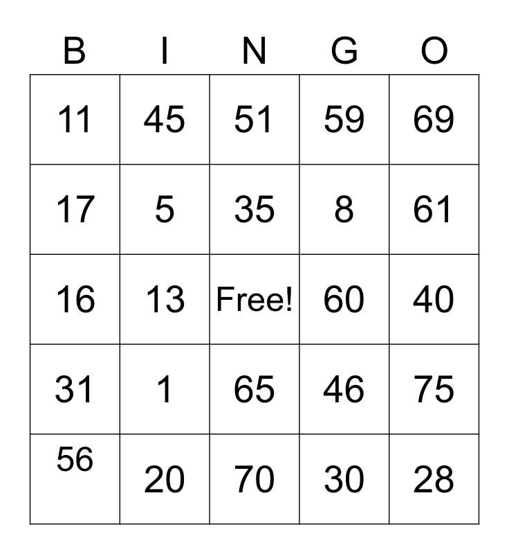 This bingo card has a free space and 24 words: 1, 20, 35, 56, 69, 11, 17, 45, 60, 65, 8, 16, 46, 75, 5, 30, 40, 51, 61, 13, 28, 31, 59 and 70.