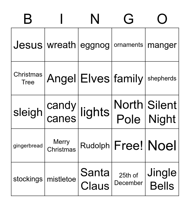 This bingo card has 25 words: Merry Christmas, Santa Claus, Elves, stockings, manger, Jesus, Christmas Tree, wreath, North Pole, Rudolph, family, sleigh, Free!, Noel, Angel, Jingle Bells, Silent Night, eggnog, shepherds, candy canes, lights, mistletoe, gingerbread, ornaments and 25th of December.