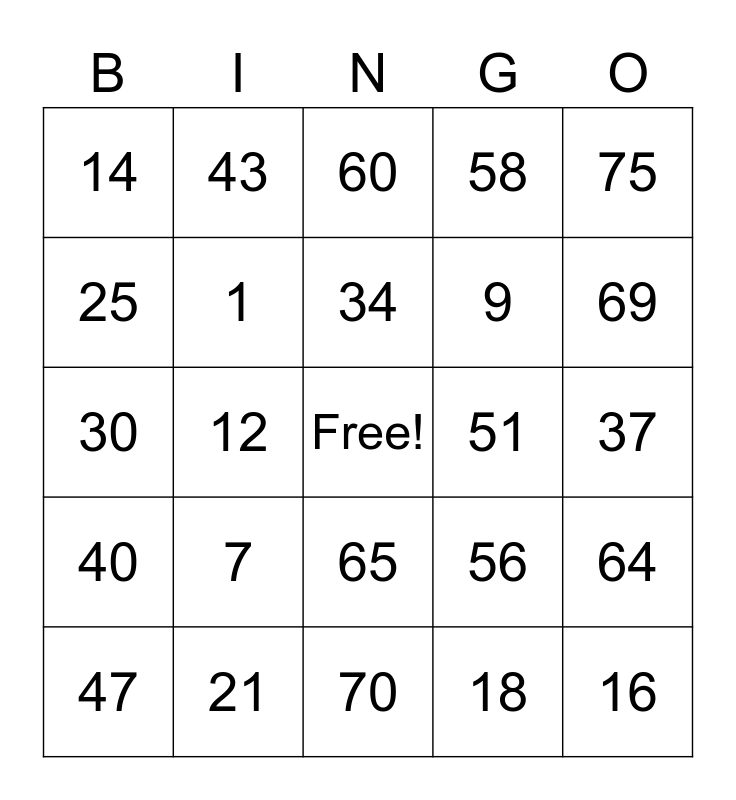 This bingo card has a free space and 24 words: 7, 21, 34, 47, 75, 14, 25, 43, 51, 65, 9, 30, 56, 64, 1, 18, 37, 60, 69, 12, 16, 40, 58 and 70.