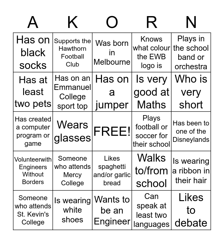 This bingo card has a free space and 24 words: Someone who attends Mercy College, Is wearing white shoes, Has on a jumper, Someone who attends St. Kevin's College, Plays in the school band or orchestra, Has on black socks, Has at least two pets, Supports the Hawthorn Football Club, Plays football or soccer for their school, Likes spaghetti and/or garlic bread, Is very good at Maths, Has created a computer program or game, Walks to/from school, Is wearing a ribbon in their hair, Has on an Emmanuel College sport top, Can speak at least two languages, Has been to one of the Disneylands, Was born in Melbourne, Who is very short, Wears glasses, Likes to debate, Volunteerwith Engineers Without Borders, Knows what colour the EWB logo is and Wants to be an Engineer.