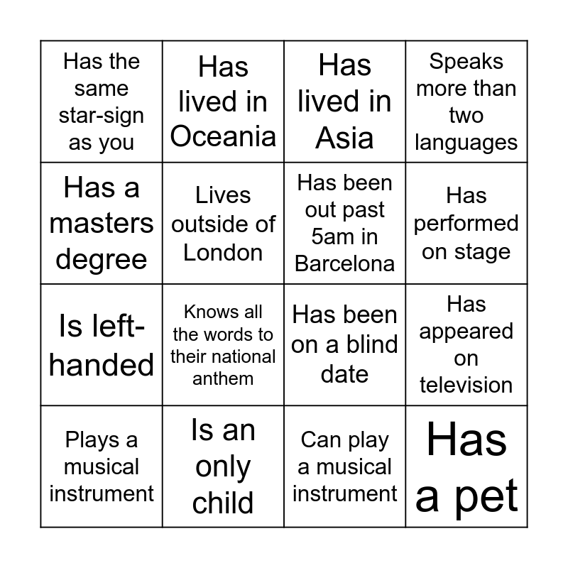 This bingo card has 22 words: Is an only child, Holds a world record, Has lived in Oceania, Has run a marathon, Lives outside of London, Has been out past 5am in Barcelona, Has the same star-sign as you, Has lived in Asia, Has been on a blind date, Has a pet, Is left-handed, Speaks more than two languages, Has eaten in the same restaurant four nights running, Has lived in Africa, Can play a musical instrument, Owns cryptocurrency, Has appeared on television, Plays a musical instrument, Knows all the words to their national anthem, Has a masters degree, Has performed on stage and Has been thrown out of a bar/nightclub.