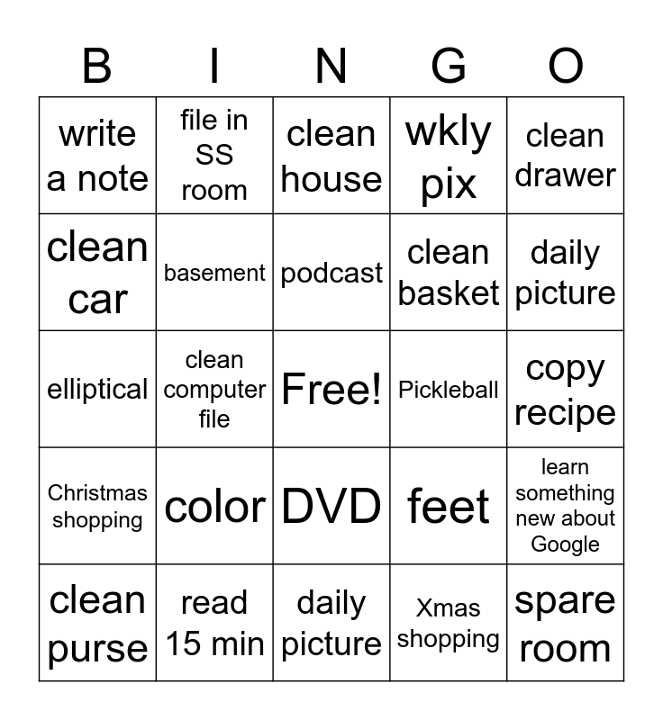 This bingo card has a free space and 29 words: clean purse, breath, clean computer file, Paint nails, write a note, clean house, basement, color, Pickleball, read 15 min, copy recipe, spare room, daily picture, Xmas shopping, daily picture, have a drink, DVD, Christmas shopping, clean drawer, elliptical, feet, read mag, clean basket, clean car, wkly pix, file in SS room, learn something new about Google, podcast and work abs.